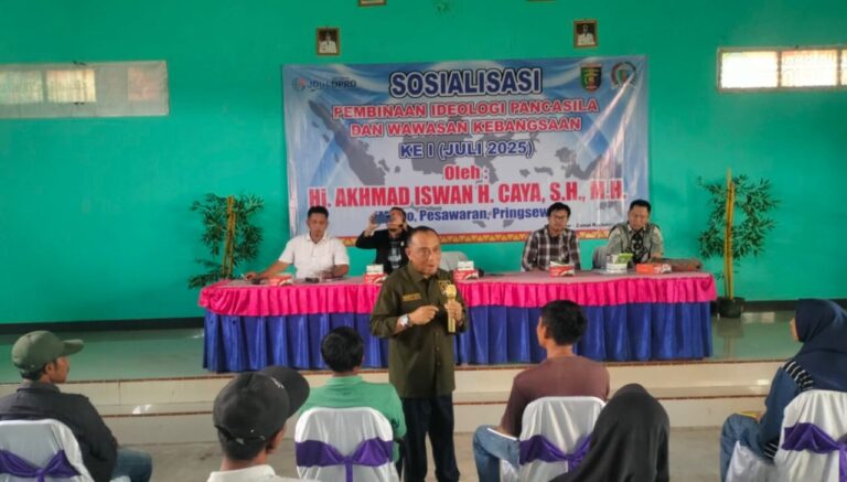 Pringsewu – Anggota DPRD Lampung, Akhmad Iswan H. Caya, menyosialisasikan Pembinaan Ideologi Pancasila dan Wawasan Kebangsaan di GSG Balai Pekon Margodadi, Kecamatan Ambarawa, Pringsewu, Sabtu (5/7/2025).