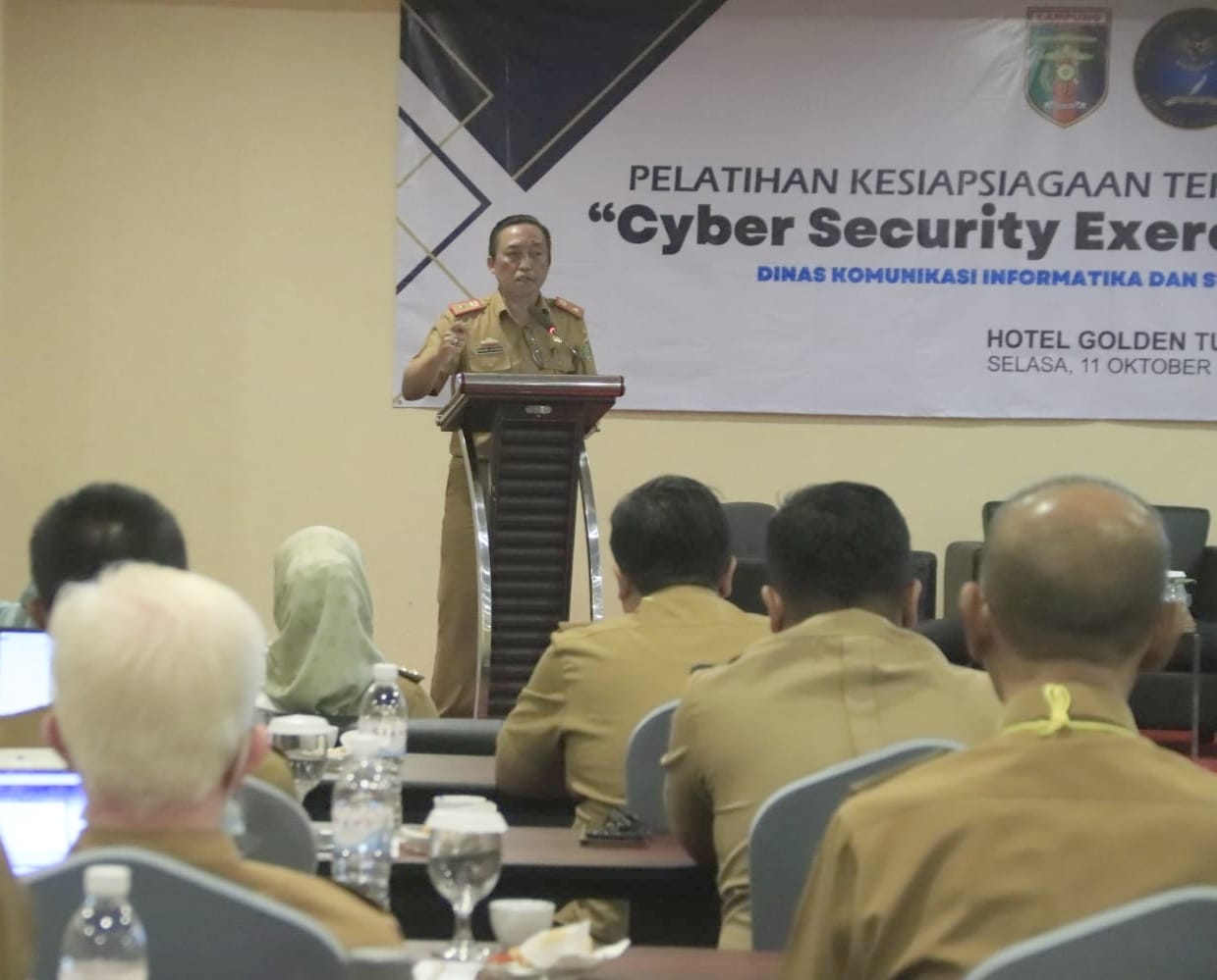 Gubernur Lampung diwakili Kepala Dinas Kominfotik Provinsi Lampung, Ganjar Jationo, membuka acara Pelatihan Teknis Kesiapsiagaan Insiden Keamanan Siber (Cyber Security Exercise Technical) bagi Kabupaten/Kota se- Provinsi Lampung, yang berlangsung di Hotel Golden Tulip Springhil, Selasa (11/10/2022).