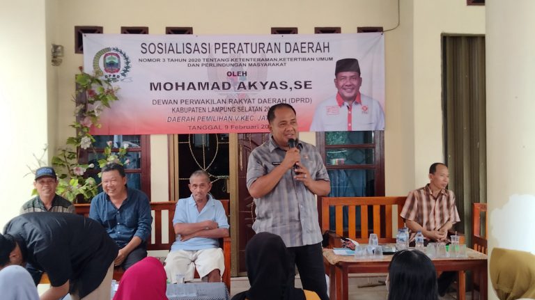 Hal tersebut disampaikan Anggota Komisi I DPRD Lampung Selatan dari Fraksi PKS Dapil V Kecamatan Jatiagung Lampung Selatan, Mohamad Akyas saat mensosialisasikan Peraturan Daerah (Perda) Nomor 3 tahun 2020 tentang Ketentraman Ketertiban Umum dan Perlindungan Masyarakat, yang dipusatkan di dusun 1B Desa Karang Anyar Kecamatan Jatiagung, Jum,at (9/2/2024)