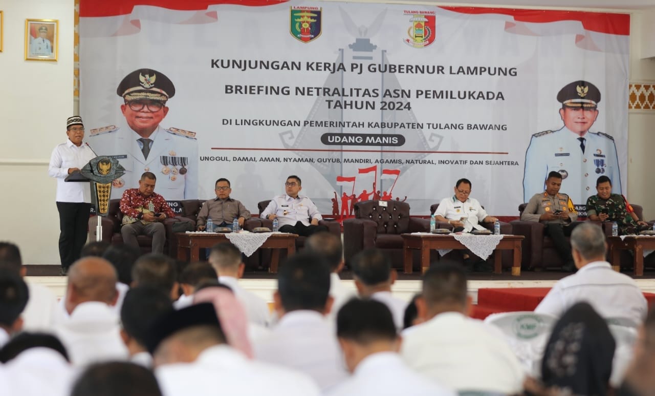 ReferensiRakyat.CO.ID – Pj. Gubernur Lampung Samsudin memberikan briefing terkait netralitas Aparatur Sipil Negara (ASN) yang digelar di GSG Kabupaten Tulang Bawang pada Kamis, 8 Agustus 2024.