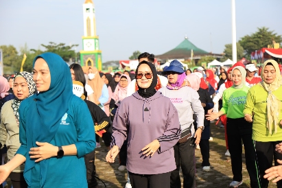 Tampak Gubernur Arinal Djunaidi dan Ketua Tim Penggerak PKK Provinsi Lampung Ibu Riana Sari Arinal, Pj Bupati Marindo Kurniawan dan kepala SKPD hadir dalam acara senam bersama tersebut.