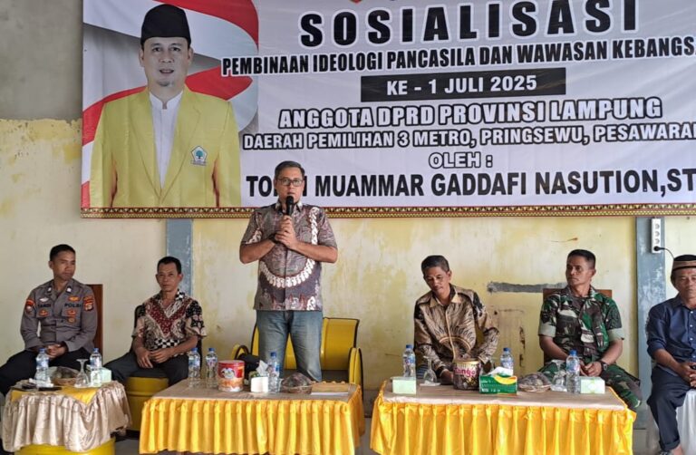 Pringsewu – Anggota DPRD Lampung, Tondi Muammar Gaddafi Nasution, menyosialisasikan Pembinaan Ideologi Pancasila dan Wawasan Kebangsaan di Pekon Sukamulya, Kecamatan Banyumas, Kabupaten Pringsewu, Sabtu (5/7/2025).